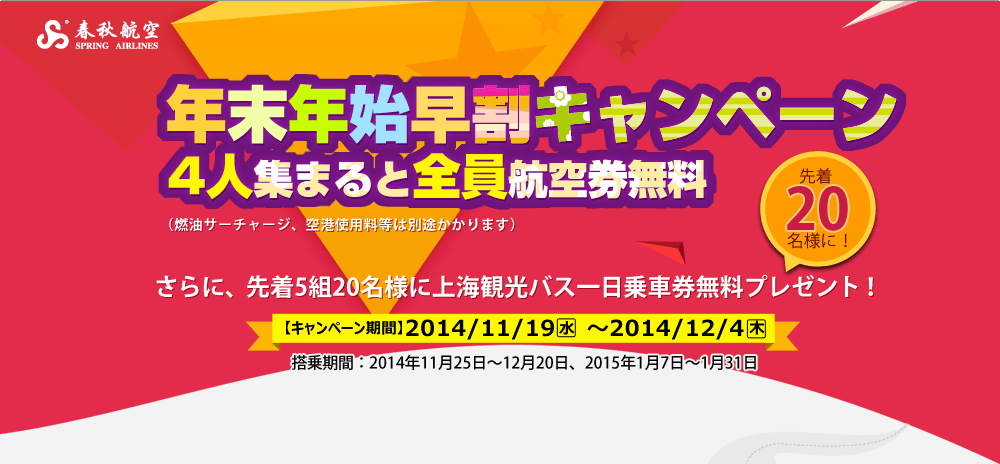 ①春秋航空公式サイトキャンペーンページで「年末年始早割キャンペーン 申込書」申込書をダウンロードし、必要事項をご記載の上、メールにてお申込み下さい。