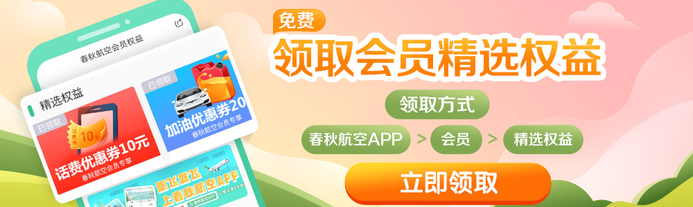领取方式:春秋航空APP-会员-精选权益领取,规则详见对应优惠券领取页面。