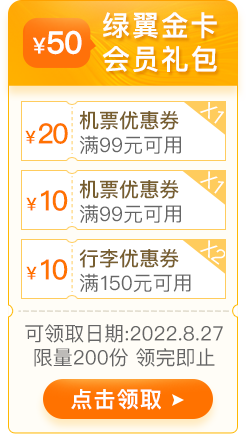(3)绿翼金卡会员礼包共计200份,礼包内含:20元机票优惠券*1张、10元机票优惠券*1张、10元托运行李优惠券*2张。