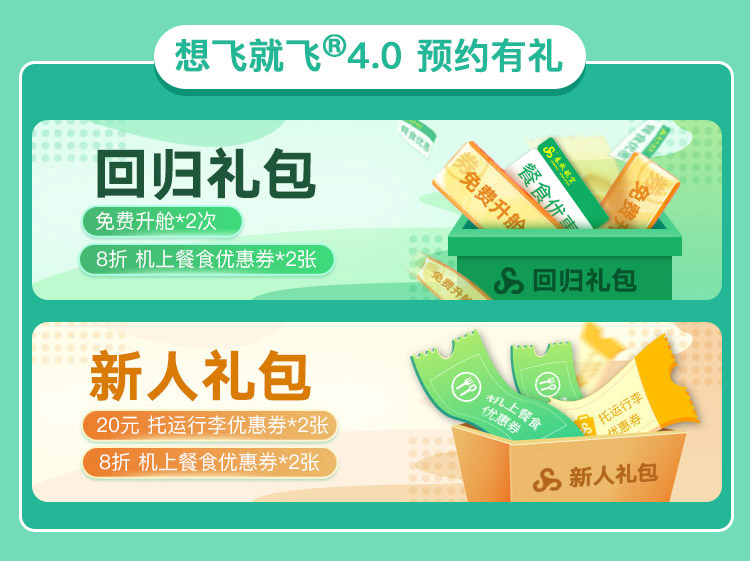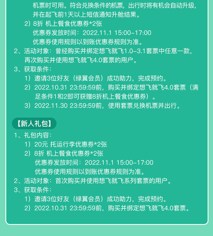 (2)2022.10.31 23:59:59前,购买并绑定想飞就飞4.0套票(满足条件1和2即可获赠8折机上餐食优惠券)。