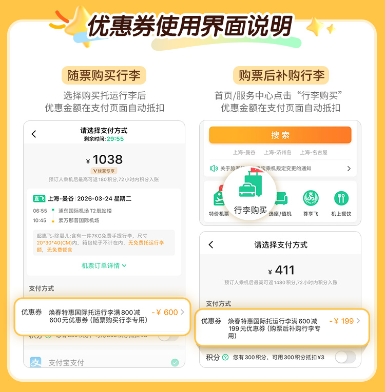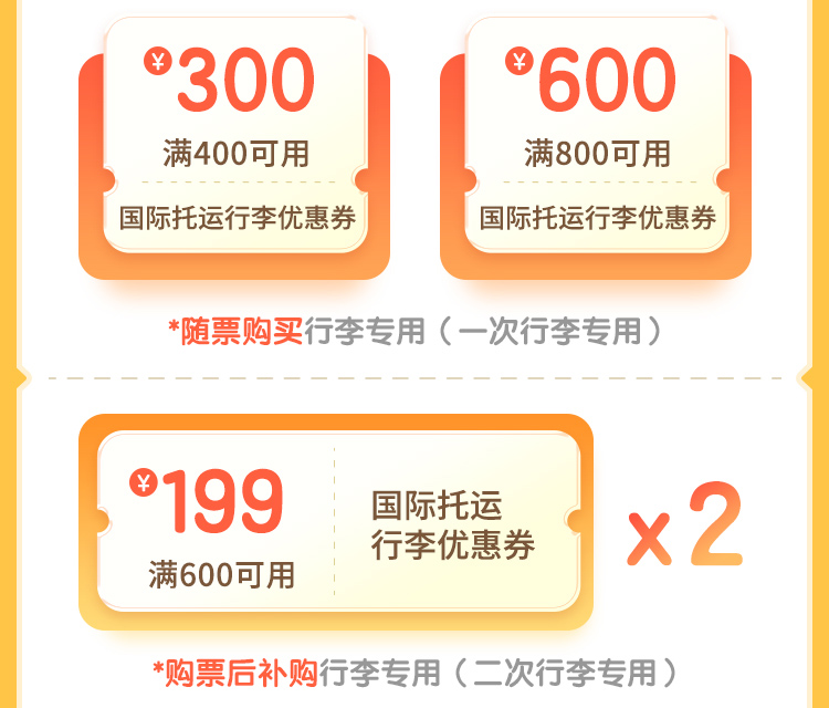 (3)【焕春特惠国际托运行李满600减199元优惠券】仅在“机票支付完成后”的补购环节可用,随机票一同下单时不可用。