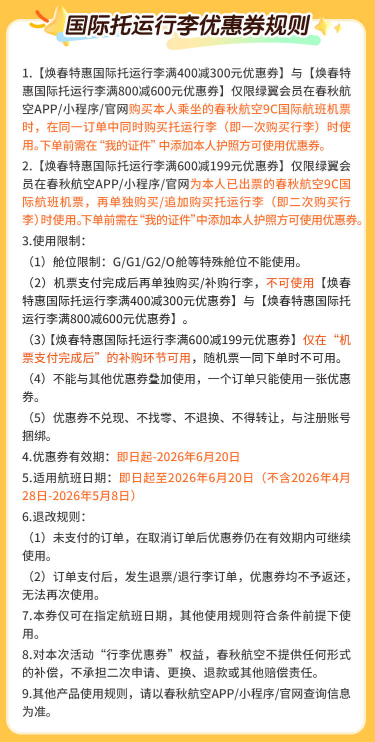 1.【焕春特惠国际托运行李满400减300元优惠券】与【焕春特惠国际托运行李满800减600元优惠券】仅限绿翼会员在春秋航空APP/小程序/官网购买本人乘坐的春秋航空9C国际航班机票时,在同一订单中同时购买托运行李(即一次购买行李)时使用。下单前需在“我的证件”中添加本人护照方可使用优惠券。