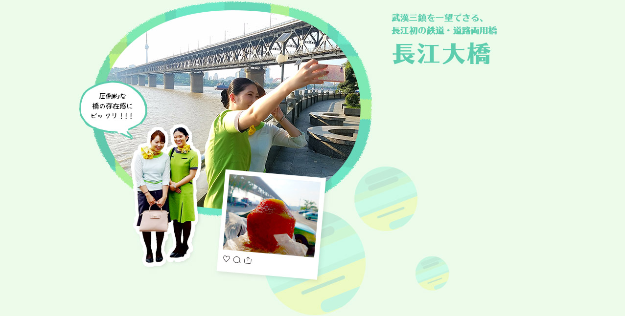 長江に初めてかけられた橋で、全長1,670m、高さ80mの大きな橋です。欄干には中国の民間伝説や、神話に基づく動物や植物が描かれており、歩きながら楽しむことができます。